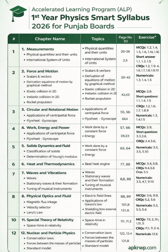 The Punjab Boards Committee of Chairmen (PBCC) has officially introduced an Accelerated Learning Program (ALP) for Physics Class 11 (1st Year) for the 2026 academic session. Under this program, selected topics have been reduced or streamlined to ensure timely syllabus completion without compromising core concepts required for higher studies.